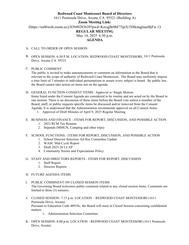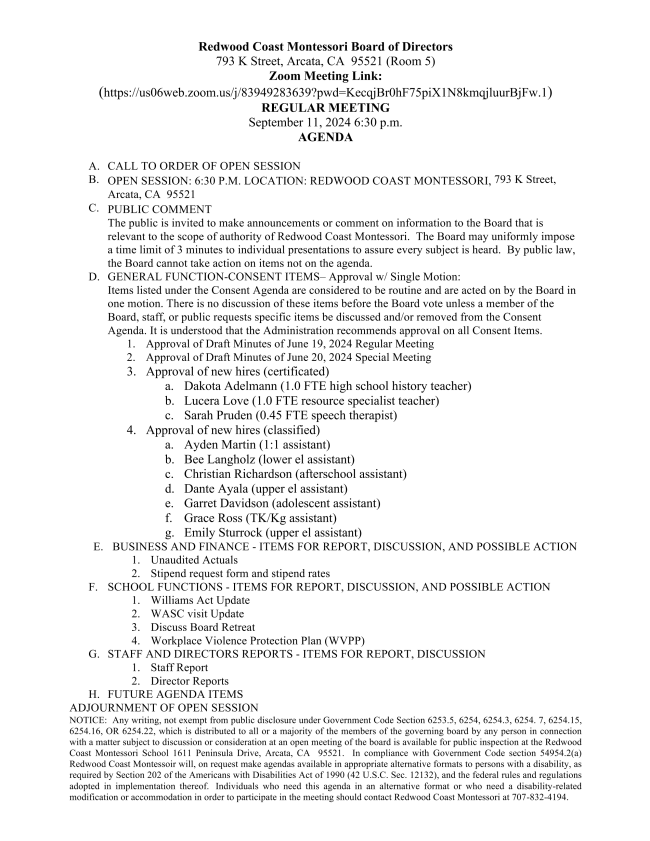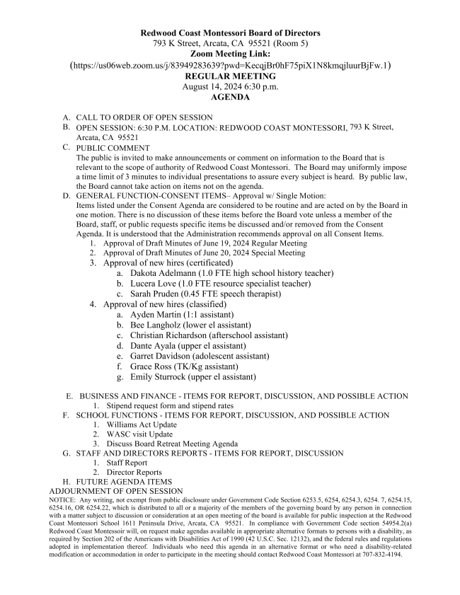 Redwood Coast Montessori is governed by a five member Board of Directors. Directors serve two-year terms and until a successor director has been designated and qualified. Each Director may serve a maximum of two consecutive terms (four years total). Directors are eligible for re-election after a minimum two year absence from Board service.